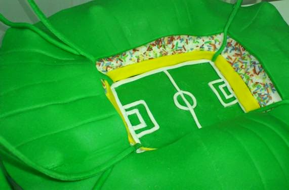 O bolo era de baunilha e red velvet (branco e vermelho, à Benfica :) e o recheio de brigadeiro de chocolate com crocante de amendoim caramelizado.
